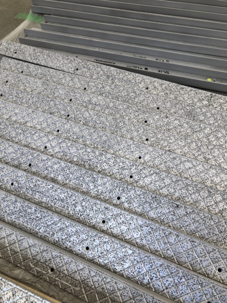 MUSEE代表の川崎が、自らニューヨーク・シカゴ・パリ・イスタンブール…と古い建築が多い都市の公共空間を訪ね歩き、昨年夏、ロンドン地下鉄で真鍮製で光輝く素晴らしい建材と出会いました。AATi社(https://www.aati.co.uk)半年間もの交渉を重ね、この度、特別に MUSEE GINZA のために31本の金属建材(Stair Nosings)を製造してもらえることになりました。特注の金物は、耐久性や美観の観点から、シルバー色のアルミ製を選択。ロンドン地下鉄と同じ意匠の建材が31本、サイズ、穴位置・口径を細かく指定して製造されました。すべり止めのため、砂状の異種素材が表面を覆い、鋳造されたもので、使用するとともに美しく研磨され、光り輝きます。