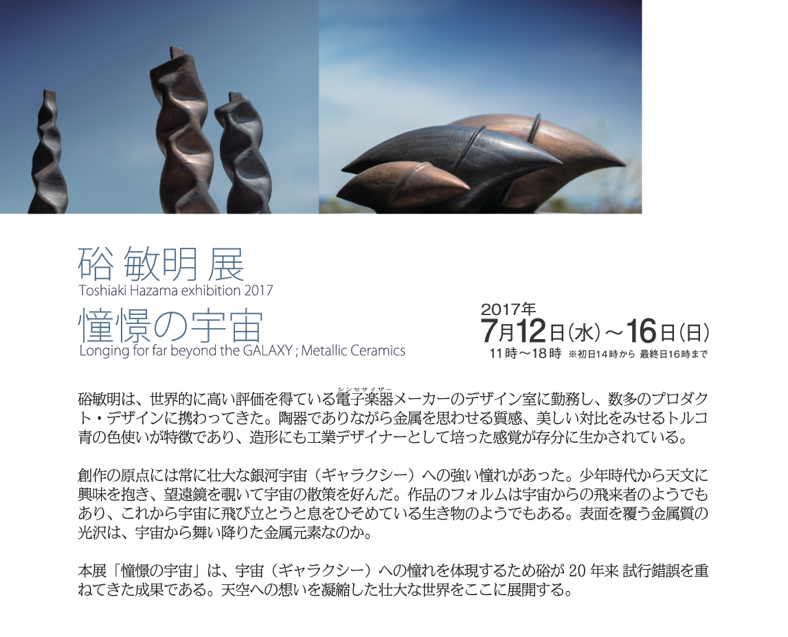 硲 敏明 展 Toshiaki Hazama exhibition 2017 「憧憬の宇宙 Longing for far beyond the GALAXY ; Metallic Ceramics」。壮大な銀河宇宙への憧れを陶器で表現する作家、硲敏明さんを紹介します。金属を思わせる質感、色彩が特徴で、宇宙からの飛来物のようなフォルムの作品が、観る者を魅了します。2017/7/12からの5日間、どうぞご期待ください。